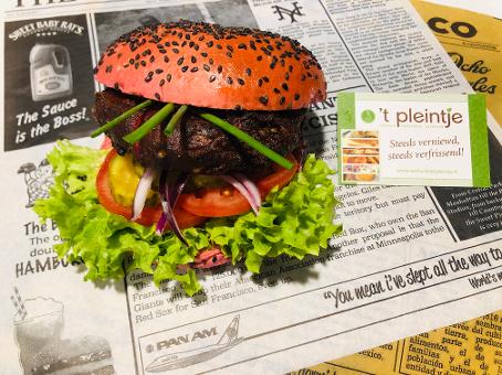 Deze burger is op basis van rode biet en soja, dat voor een unieke smaakt zorgt.